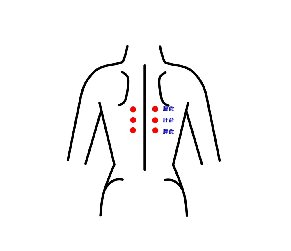 脾兪・・・肝兪から背骨の山を2つ下がった高さ(第11〜12胸椎棘突起間)